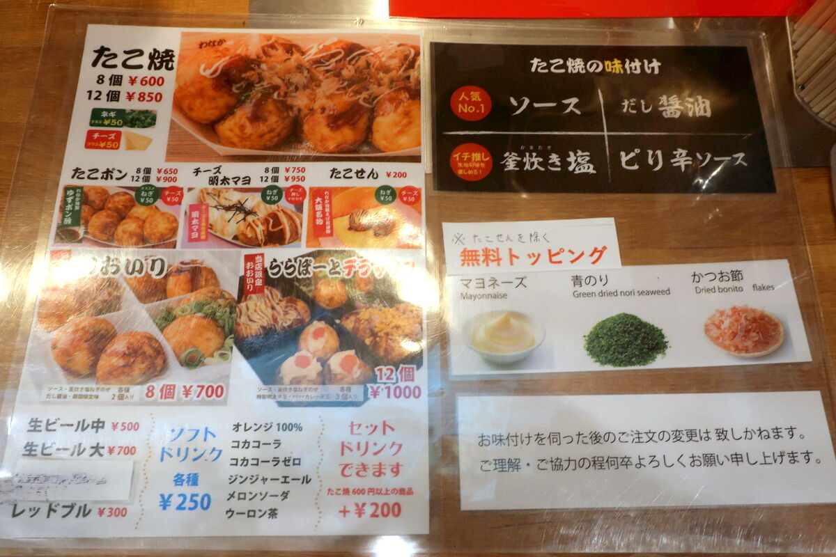 買ったのは看板商品のたこやき8個(600円)と、生ビール中(500円)。